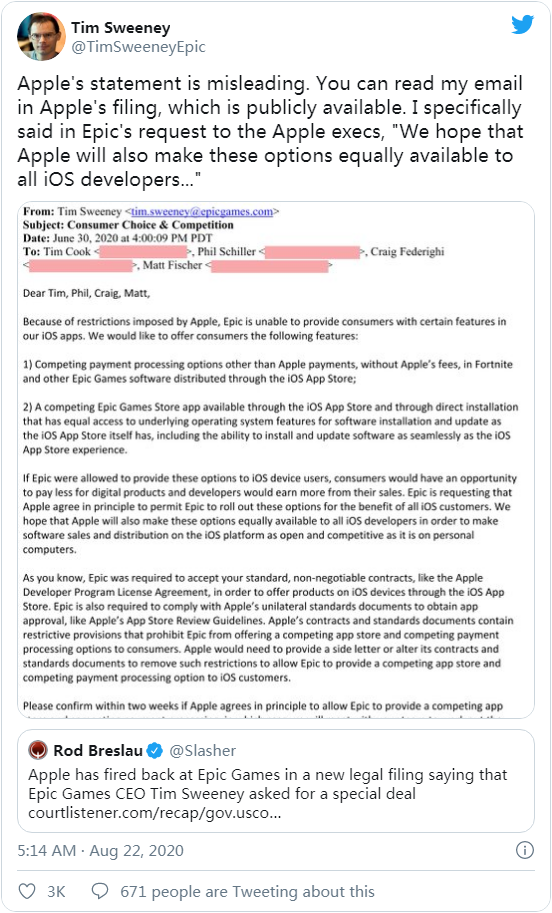 然而 Epic CEO Tim Sweeney 表示,苹果有关《堡垒之夜》被下架前的一系列事件描述都具有“误导性”,因为该公司在最初的邮件中就恳请 App Store 向所有 iOS 开发者提供这一豁免。
