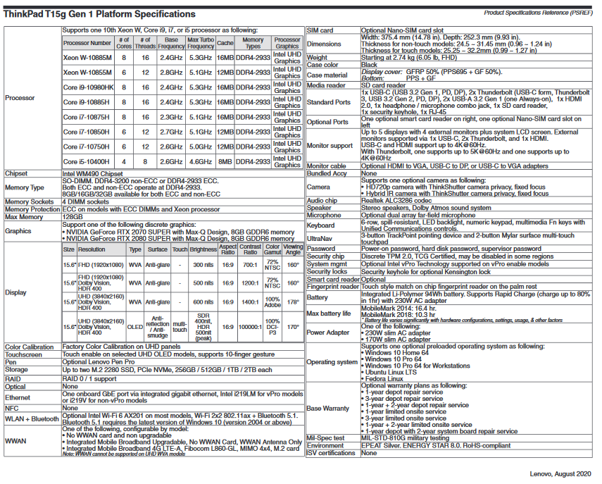 规格表中详细介绍了ThinkPad T15g Gen 1可提供的多种配置,CPU选项包括英特尔酷睿i5-10400H、酷睿i7-10750H、酷睿i7-10850H、酷睿i9-10885H以及酷睿i9-10980HK。此外,英特尔还有两款Xeon选择:Xeon W-10855M和Xeon W-10885M。