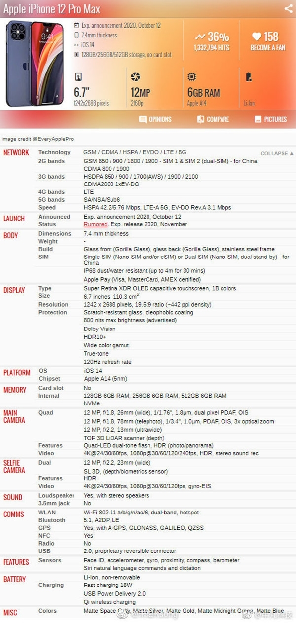 据外媒此前爆料,iPhone 12 Pro Max将于10月发布,11月正式发售(传闻);厚度仅有7.4mm,支持IP68级防尘防水;配备一块6.7英寸XDR OLED屏幕,分辨率为1242 x 2688,ppi为442,支持HDR 10+,有120Hz高刷新率,运行iOS 14系统。
