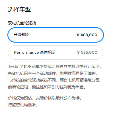 随着国产时间节点的临近,特斯拉Model Y在国内的预售选配工作,也在悄然进行当中。日前,特斯拉官网上线了Model Y的选装配置计算器。根据官网信息显示,国产Model Y将会首先推出两款车型,分别是长续航全驱版和Performance高性能版,预售价为48.8、53.5万元。
