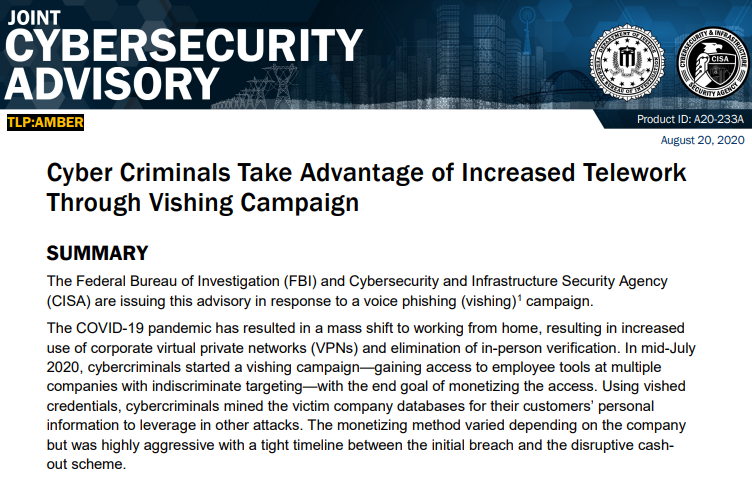 "COVID-19大流行导致大规模转向在家工作,导致企业虚拟专用网络(VPN)的使用增加,在2020年7月中旬,网络犯罪分子开始了一场名为vishing的活动--以无差别获得多家公司员工工具的访问权--最终目标是将访问权货币化。"