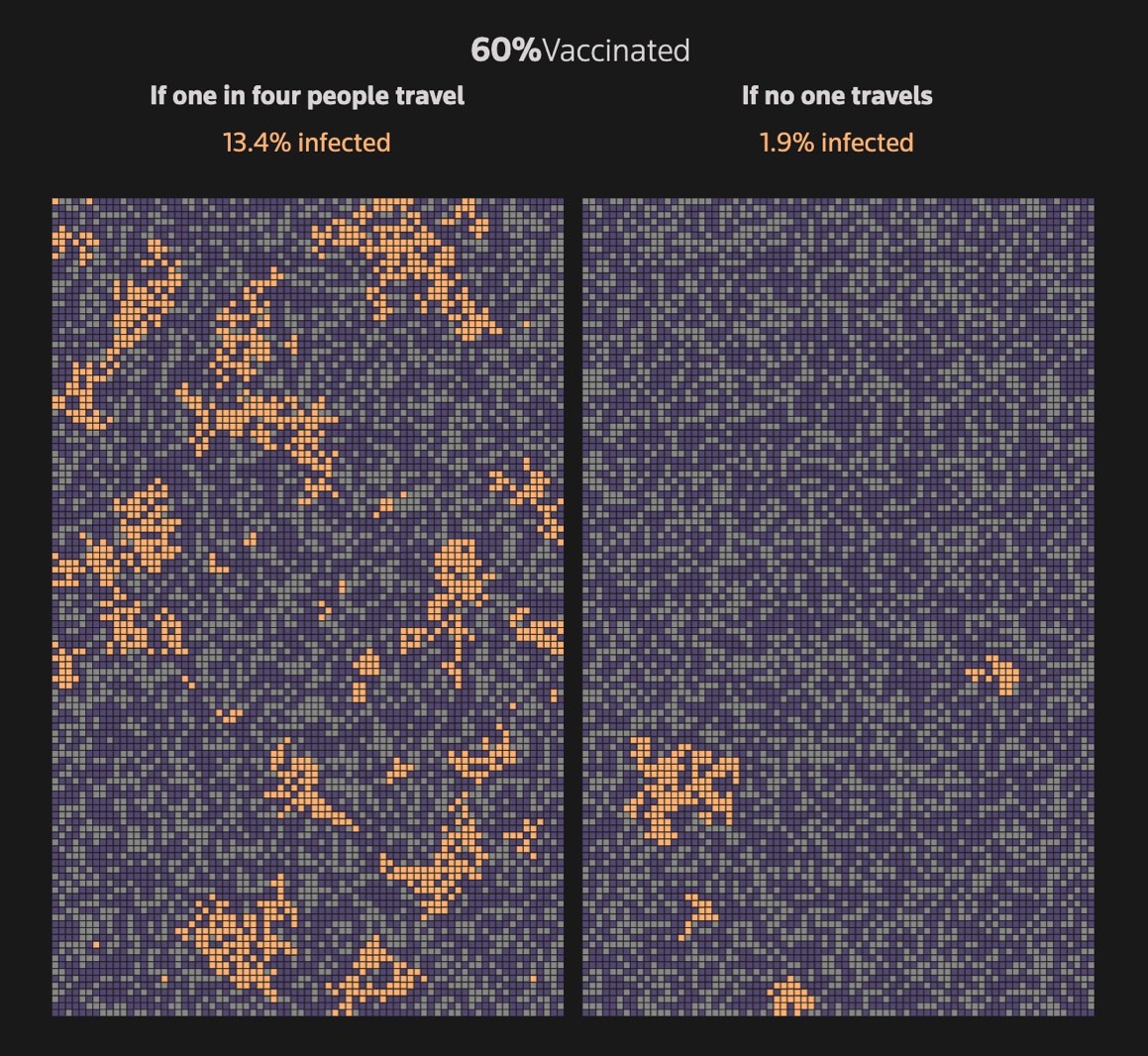 据推算,如果60%的人口不出去旅行并接种疫苗那么感染率就会显著下降。更有趣的是,上面的图像显示了COVID-19在当前情况下的传播模型。口罩和距离可以起到很大的作用,它们可以让社区中的传播率低得多。同样需要注意的是,接种疫苗后仍需要戴口罩和保持社交距离。如果疫苗的有效性是70%,接种的人仍有30%的机会感染病毒。