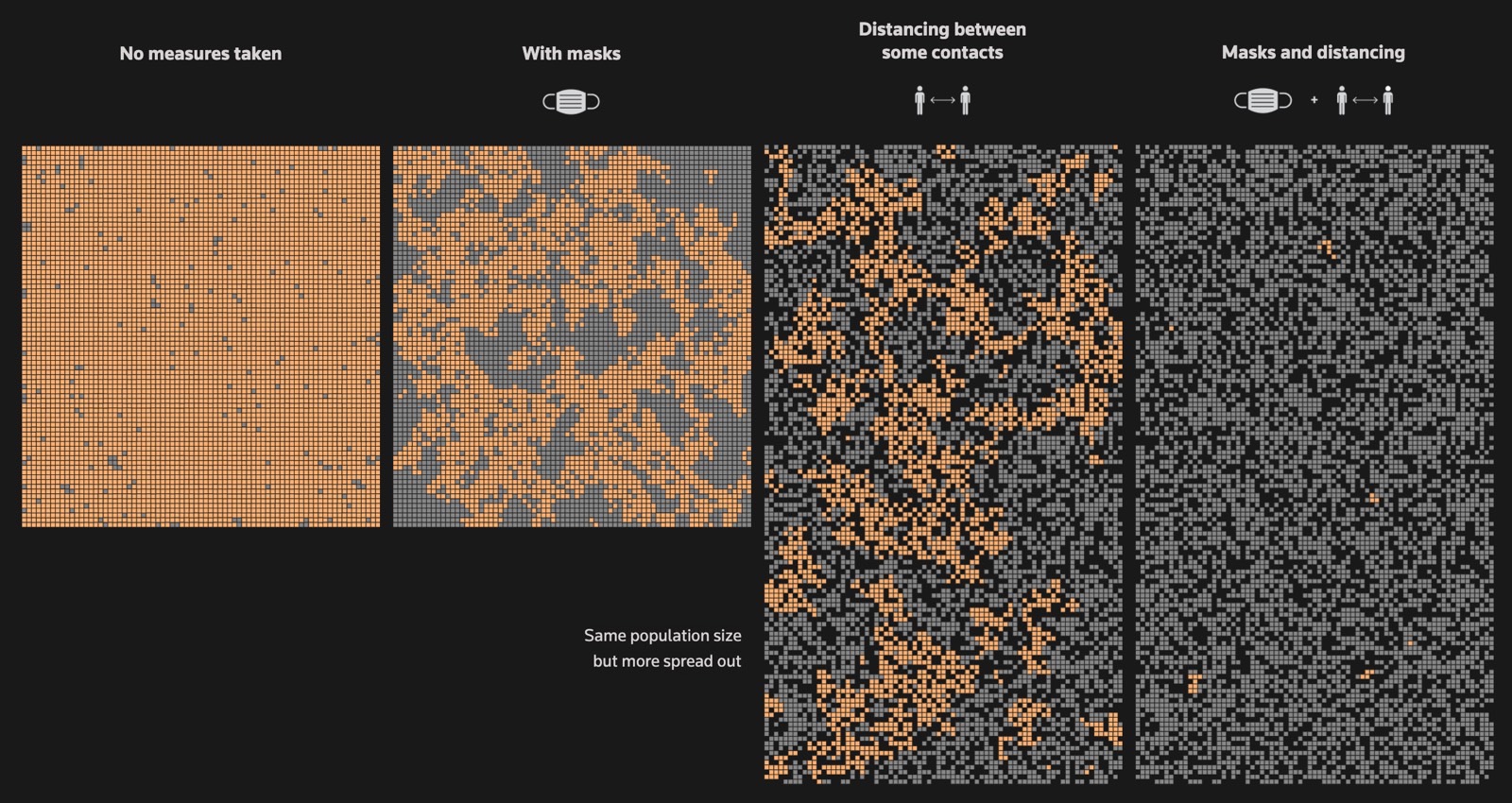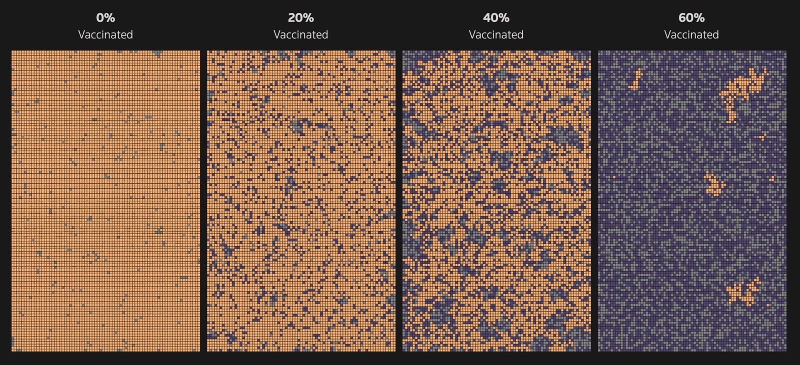 Reuters Graphic模拟了一个9000人的社区,图中的每个方块代表一个人。受感染的人用橙色标出,而接种疫苗的人用紫色标出。上图显示了一个社区中根据接种疫苗的人口比例的不同程度的传染性。