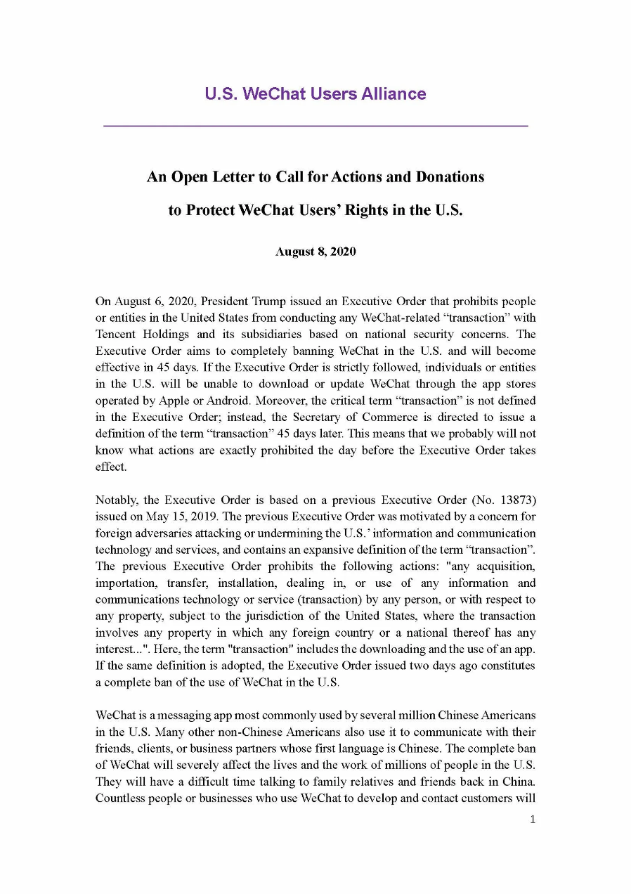 据悉,控方包括非营利性组织美国微信用户联盟(U.S. WeChat Users Alliance)、一家小企业、一些个体用户。他们表示,原告跟这款人气应用或其中国母公司腾讯控股有限公司不存在任何关联。他们称,用户联盟则是由在商业和个人生活中依赖微信的人组成。