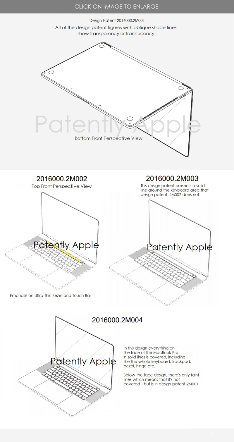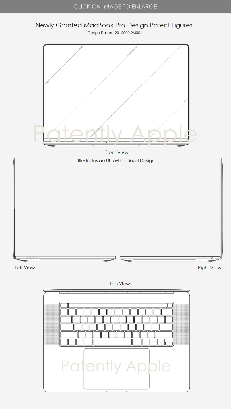 下面是被授予专利2016000.2M001的一个例子,该专利覆盖了MacBook Pro的超薄边框设计。除外观设计专利号外,其他均相同。