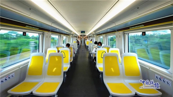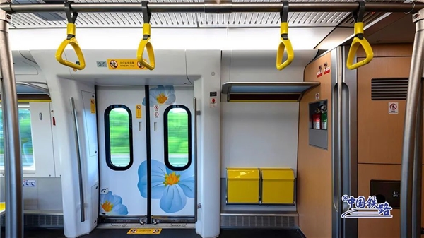 车内采用柠檬黄作为主色调,色彩饱满鲜艳,极具动感活力。每节车厢中部有4个花形多杆立杆扶手,及多个吊环扶手方便旅客抓握,3号车厢设有洗手间。