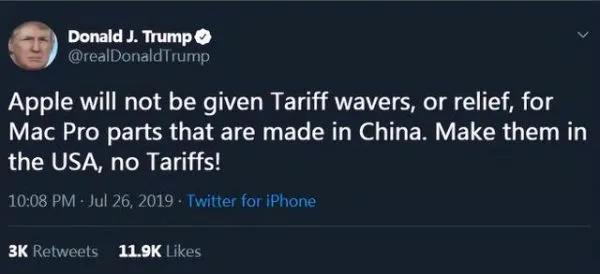 特朗普对此也想通过关税来说服苹果回迁,表示“不会给苹果Mac Pro电脑的中国造零部件减免关税。在美国制造这些零部件,就没有关税!”