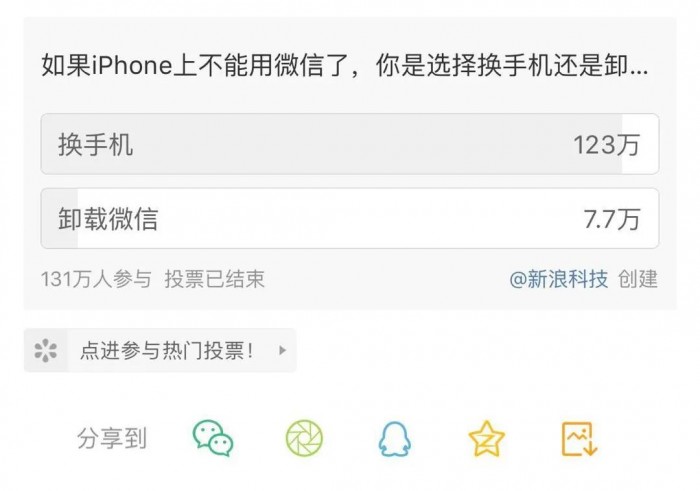 其实很多人本身是想看看,到底是微信的黏性大还是iPhone的需求大,数据说明了一切,早前有调查数据显示,选择微信与选择iPhone是20:1。在多数的调查中,选择微信的用户均是碾压式的超过选择iPhone的用户数。