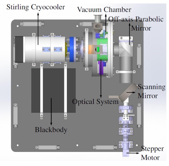 2.5—5微米是热红外波段的开始,是地面观测的重要窗口所在区域。由于天光背景强度极其微弱,探测器输出信号低于nA量级,研究团队采用锁相放大技术成功提取出淹没在噪声中的信号;为了降低探测器暗电流的影响,探测器制冷到-150℃以下;为了克服由于仪器带来的背景热噪声,进行了适应低温的斩波器和光学设计。为了克服地面大气的吸收效应,地基红外望远镜只能从若干大气窗口进行观测。研究团队根据探测器在2.5—5微米波段上高响应的性能,利用线性可变滤波片在此波段线性可变的特点,研制出了此波段上连续扫描观测的红外天光背景测量仪。