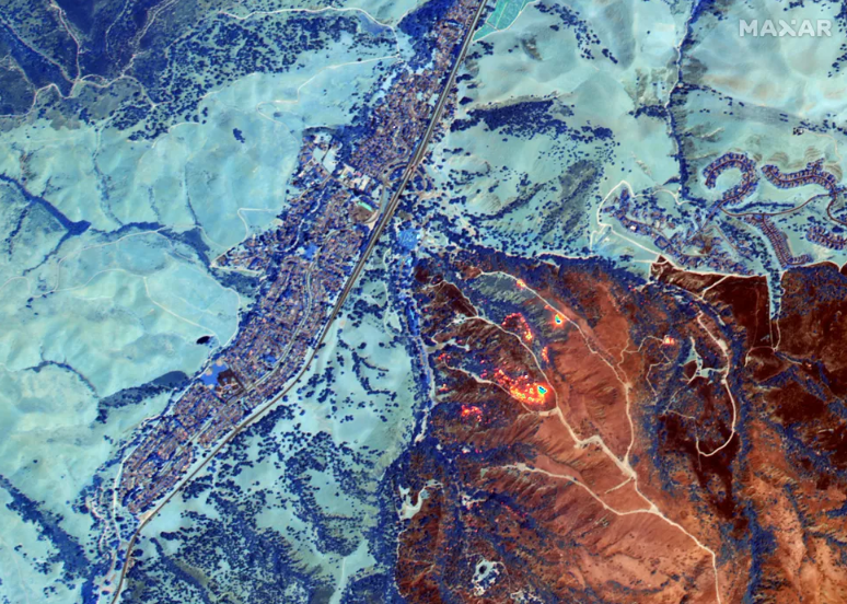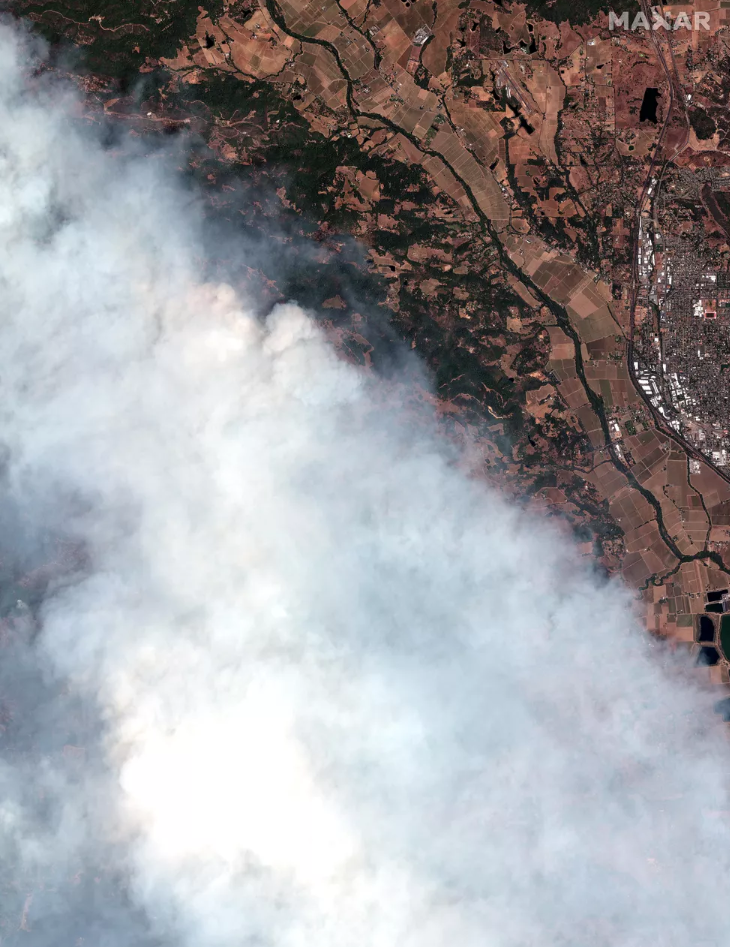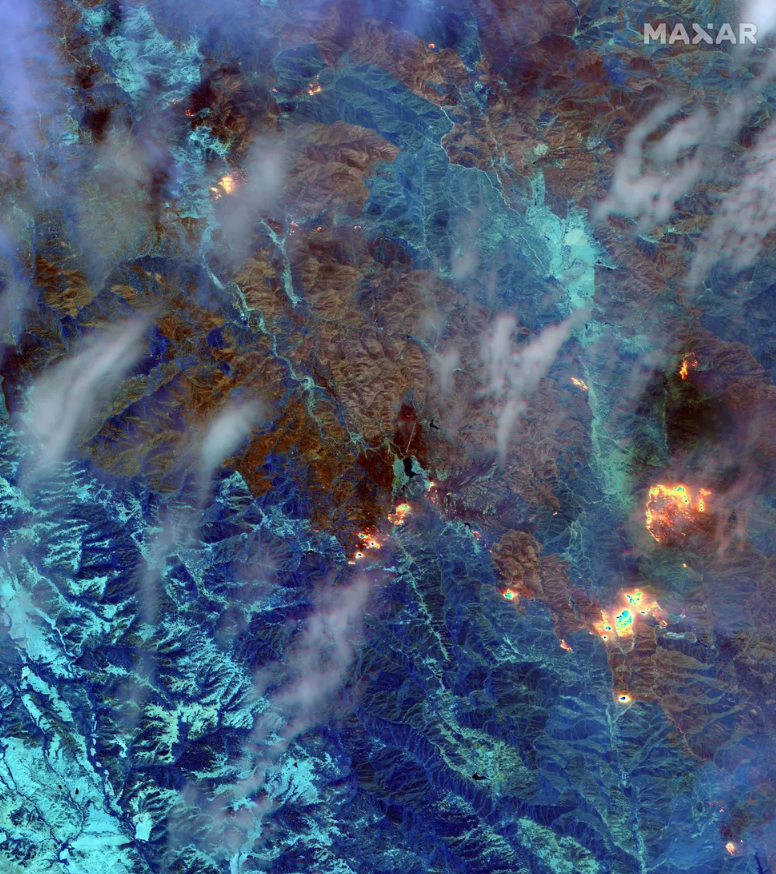 Maxar的WorldView-3卫星配备了短波红外传感器,可以穿透烟雾,帮用户探测到活跃的火灾、热点,并准确绘制和测量燃烧区域,包括LNU大规模闪电山火、CZU大规模闪电山火、SCU大规模闪电山火等。