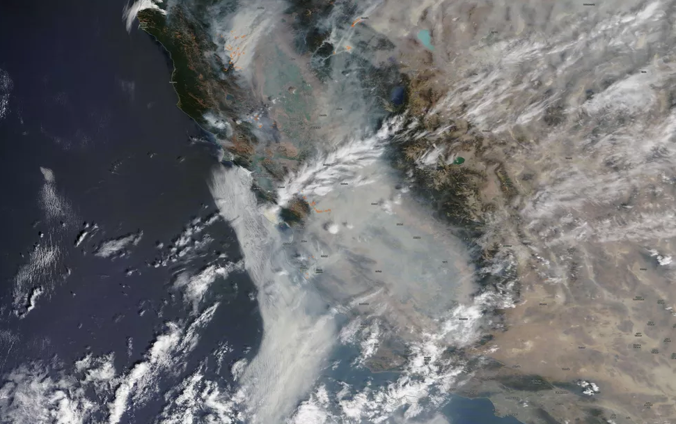 这张来自NASA的Terra Modis(中分辨率成像光谱仪)卫星的图片显示了从北边的雷丁到南边的洛杉矶的加州景象,浓烟几乎覆盖了整个加州。