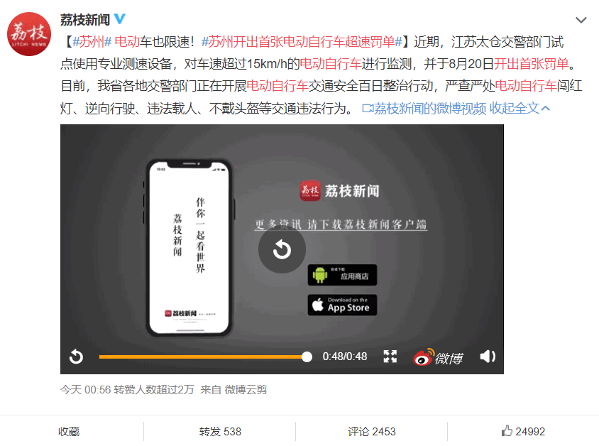 电动自行车因为出行成本低、便捷、实用,在全国范围内受到消费者的喜爱。不过,同时因为电动自行车的行驶速度快,安全防护措施不足。因此,不少地区对于电动自行车的行驶速度也做出了严格限制规定。而苏州更是开出了首张电动自行车的超速罚单,这也引起了不少网友的讨论。