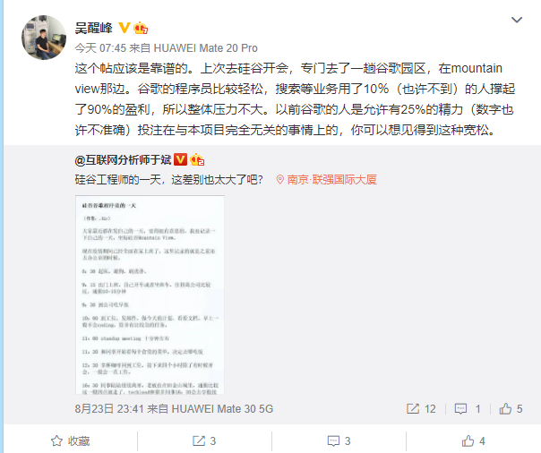 对于爆料的真实性,华为前专家吴醒峰博士指出“这个帖应该是靠谱的。上次去硅谷开会,专门去了一趟谷歌园区,在mountain view那边。谷歌的程序员比较轻松,搜索等业务用了10%(也许不到)的人撑起了90%的盈利,所以整体压力不大。”他还爆料“以前谷歌的人是允许有25%的精力投注在与本项目完全无关的事情上的,你可以想见得到这种宽松。”