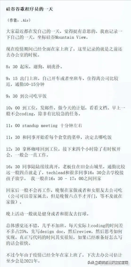 日前,认证博主@互联网分析师于斌 分享了硅谷谷歌程序员的一天,作者.Air自曝8点半起床,9点15开车或者坐班车去公司,9点30抵达后吃早饭。