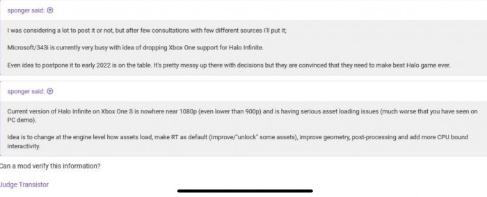 Resetera论坛认证用户“Sponger”写道: “ 目前Xbox One S版本的《光环:无限》远不及1080p (甚至还低于900p) ,并且存在严重的资源加载问题(比PC版演示更糟糕)。开发团队的想法是在引擎层面改变资源的加载方式,将RT设置为默认值(改善/“解锁”某些资源),改善模型的多边形结构,进行后期处理并添加更多的CPU绑定交互性。”
