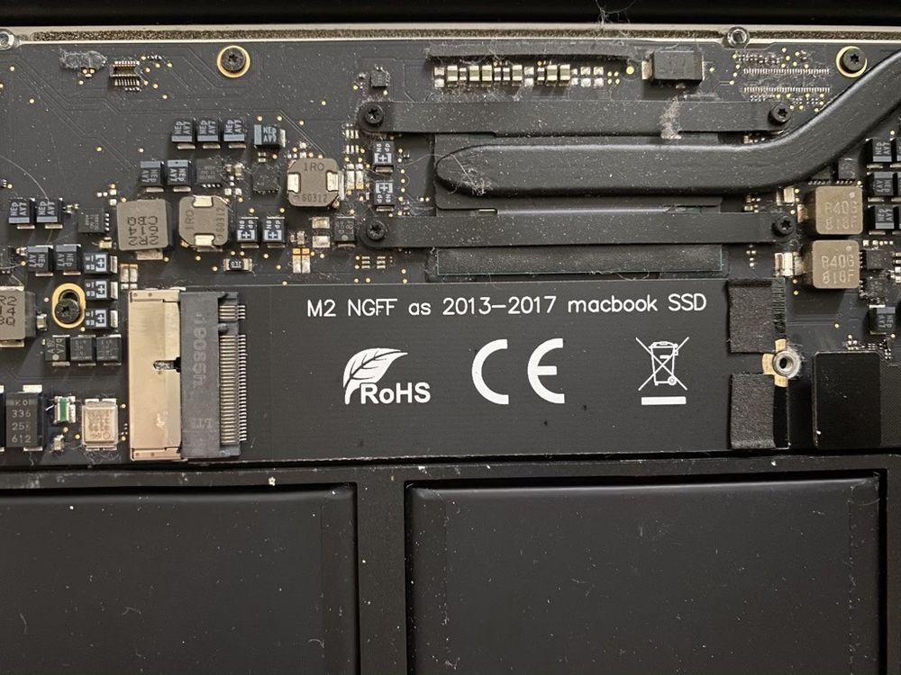 找到 SSD 的位置,它在 MacBook Air 的中间位置,有一个固定它的Torx螺丝。拧开后取出硬盘,放在一边。取出Sintech NGFF转M.2 NVMe适配器,插入原硬盘的位置。然后,将新的NVMe硬盘插入适配器。当所有的东西都对齐后,NVMe硬盘末端的凹槽将与Torx螺钉出来的柱子对齐。