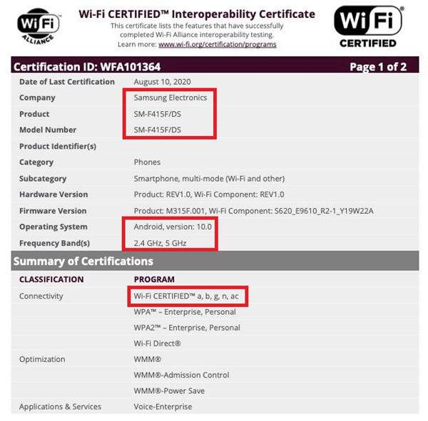 8月24日消息,型号为SM-F415F的三星新机获得Wi-Fi认证,由于三星折叠屏手机的型号均为SM-FXXX,由此确认SM-F415F是一款折叠手机。SamMobile指出,三星廉价折叠屏手机支持双SIM,提供64GB和128GB两种存储,有黑色、蓝色和翡翠色三种配色。