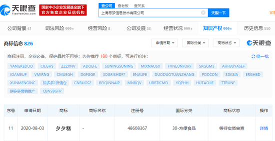 值得注意的是,天眼查APP显示,早在2018年8月,上海寻梦信息技术有限公司就曾申请注册过多个“拼夕夕”的商标,国际分类包括“科学仪器”、“网站服务”、“社会服务”等,目前商标状态多数显示为“等待实质审查”。2020年8月,上海寻梦信息技术有限公司再度申请“拼夕夕”商标,国际分类为“33-酒”。