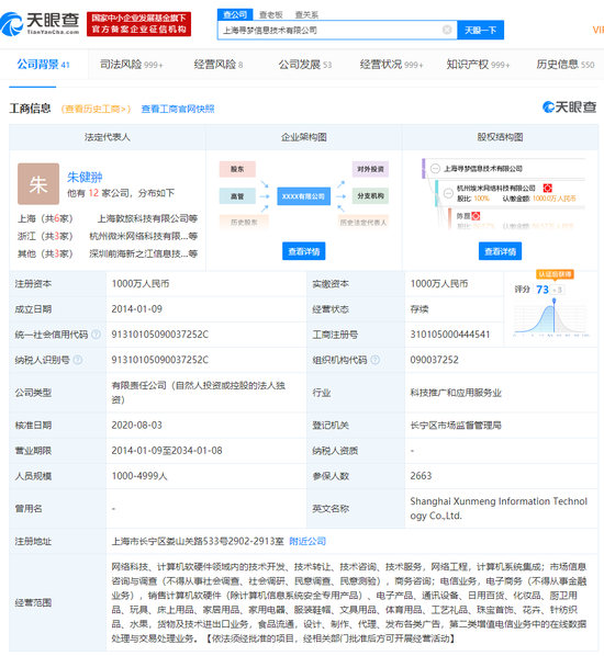 天眼查APP显示,上海寻梦信息技术有限公司成立于2014年1月,注册资本1000万人民币,公司经营范围包括网络科技、计算机软硬件领域内的技术开发、技术转让、技术咨询、技术服务,网络工程、计算机系统集成等,由杭州埃米网络科技有限公司全资持股。