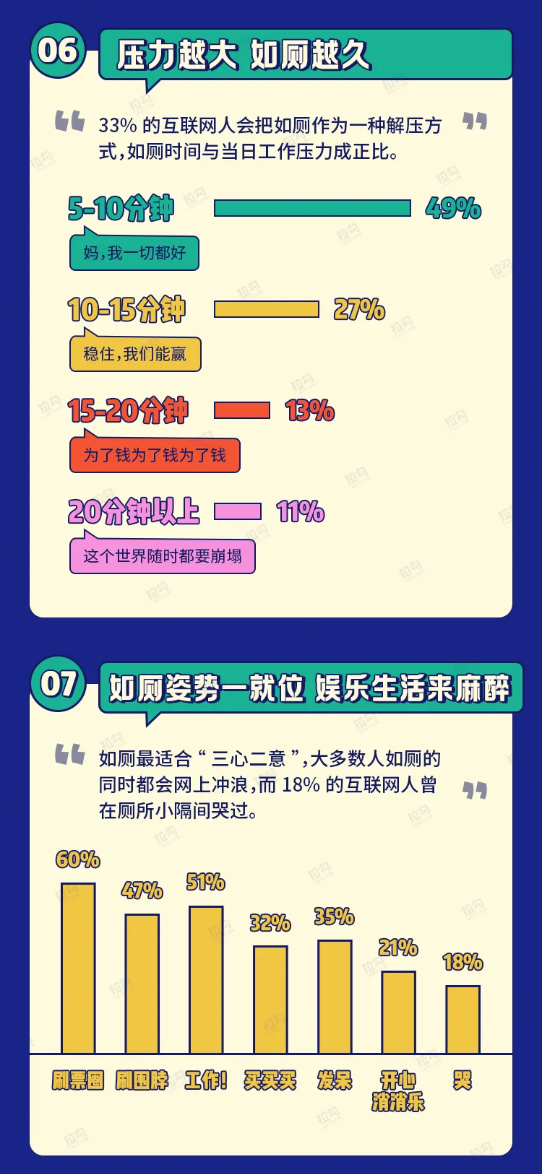 有意思的是33%的互联网人还会把如厕作为一种解压方式,如厕时间与当日工作压力成正比。49%的人如厕时长为5-10分钟,27%的人为10-15分钟,13%的人为15-20分钟,11%的人为20分钟以上。