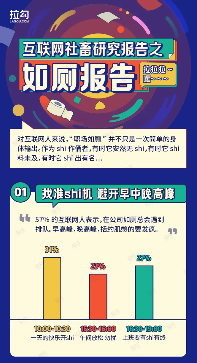 报告显示,如厕也有高峰期,57%的互联网人表示在公司如厕总会遇到排队。其中10:00-10:30如厕拉屎人数占比31%,15:30-16:00如厕拉屎人数占比23%,18:30-19:00如厕拉屎人数占比27%。