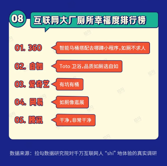 报告还总结了互联网大厂厕所幸福度排行榜,其中360、自如、爱奇艺位居前三,网易和腾讯分别位列第四和第五。