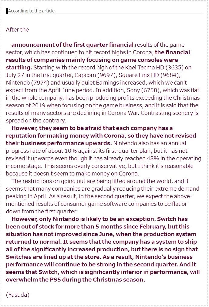 根据过去对游戏行业进行过分析的资产管理公司日本公司Ace Securities Co.的说法,次世代主机的问题不在于Xbox Series X和PS5哪一个更加优秀,而是Switch将会比这两个更加成功。