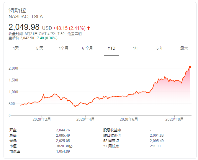 特斯拉近期宣布以1:5的比例进行股票分拆,似乎在很大程度上推动了其股价的上涨。特斯拉于8月11日(该公司宣布拆股消息的当天)收于1374.39美元,但目前交易价格已达到约2105美元,在不到两周的时间内上涨了53%,尽管股票分拆对公司基本面没有任何影响。