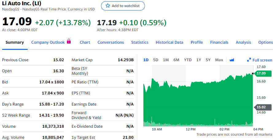 图:理想汽车首获两个“买进”评级,股价涨近14%