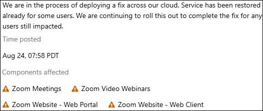 截至美国东部时间周一下午1点,Zoom表示多数用户的网络会议功能都已恢复正常。