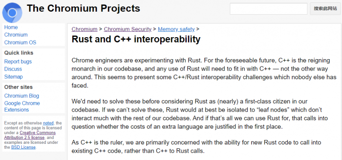 Chrome 团队也开始尝试 Rust 了。在 Chromium 官网近期发布的文档中,“Rust 与 C++ 的互操作性”作为一项尚待解决的挑战被提出。现阶段,Chrome 工程师很清楚 C++ 是第一位的,并且“在可以预见的将来仍然是代码库的统治者”。