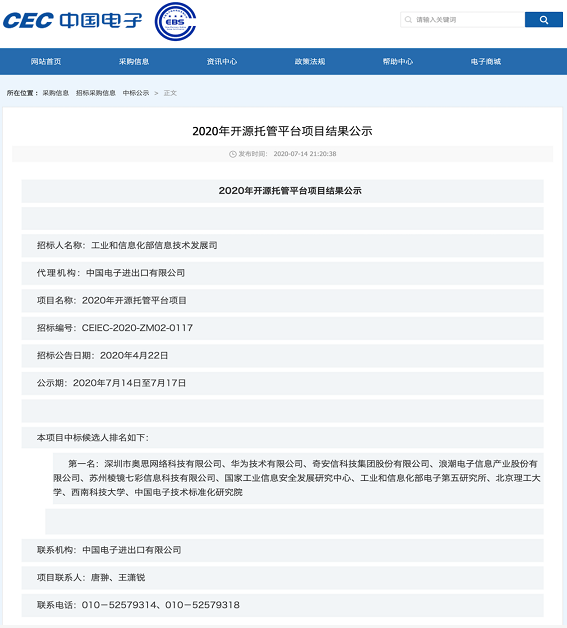 7 月 14 日,工信部公布了“2020 年开源托管平台项目结果”,选定依托“码云 Gitee” 建设中国独立的开源托管平台。