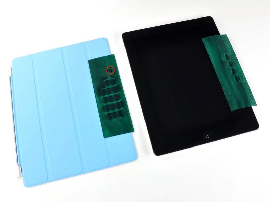 有意思的是,当时 iFixit 拆解时也找来了一块磁极观察片,同样能清晰看到 Smart Cover 和 iPad 2 内部的小磁铁,两部分加起来共有 31 个。