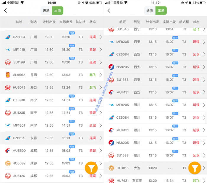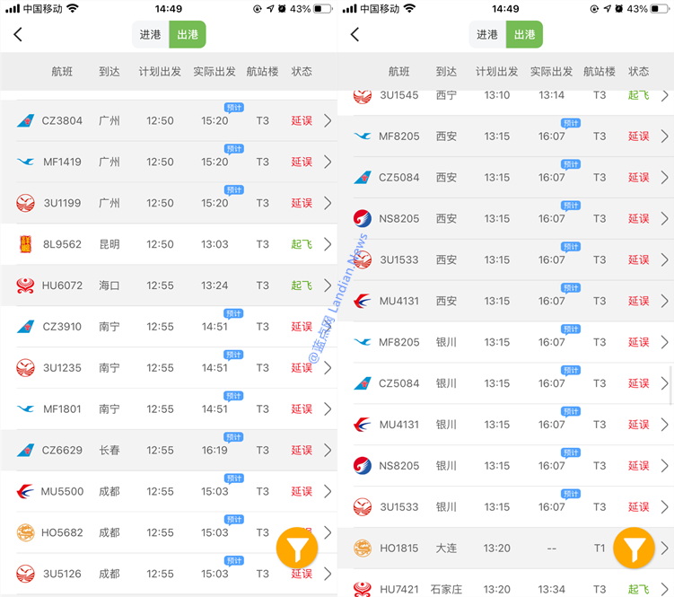 部分没有使用中航信提供支撑系统的机场和航班可以使用,而受影响的机场太多导致大多数航司无法安检和值机。目前中航信系统似乎已经恢复,蓝点网查看杭州萧山机场离港航班发现当前多数航班标注延误并在排队准备离港。