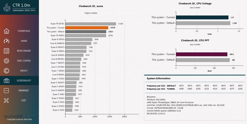 CTR特别针对Zen 2小芯片架构特点而设计,基本操作原理就是利用1USMUS自己开发的拷机软件Prime95,评估每一个CCX模块的体质,并基于特定的算法,对它们独立进行降压、超频设置,从而获得最佳平衡,并保留所有节能技术(之前是不可能的),最终达到既提高频率,又不增加功耗的目的,而每一颗处理器的超频结果都会截然不同。