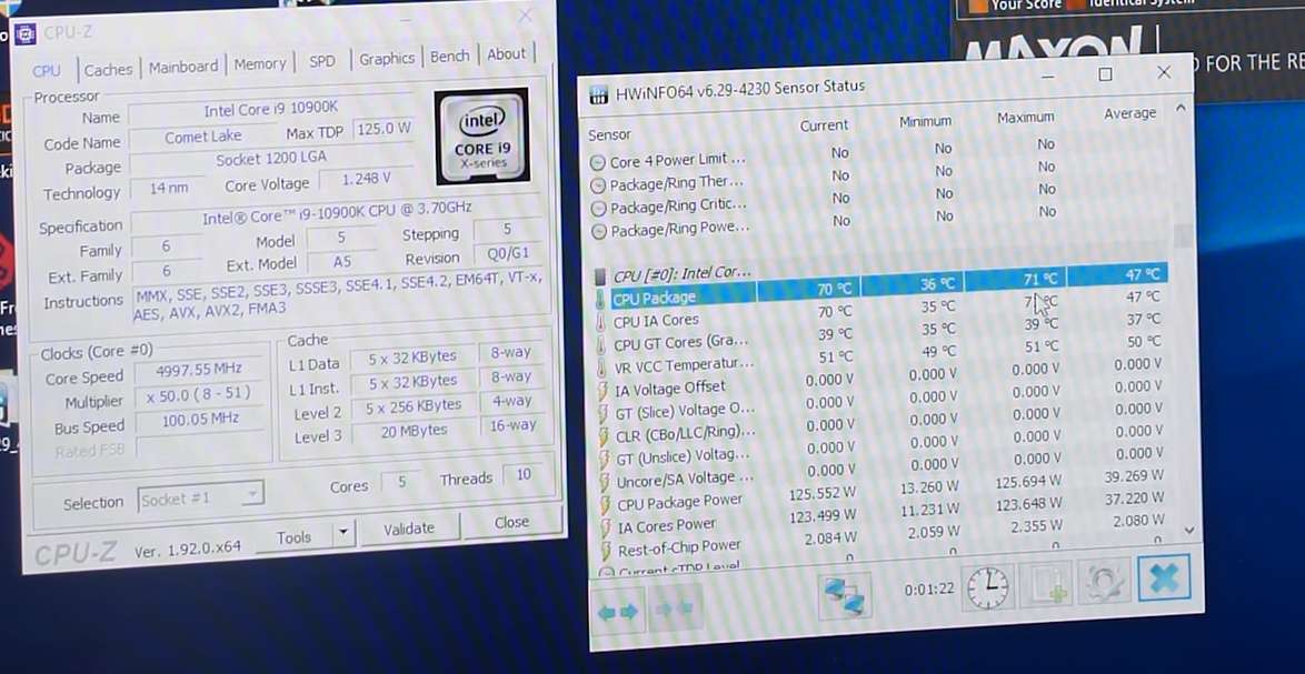 对于这件事,罗马尼亚超频高手der8auer日前做了验证,首先他将酷睿i9-10900K在10核状态下超频到了5.0GHz,这时候R20跑分温度低于80°C,功耗约为231W。