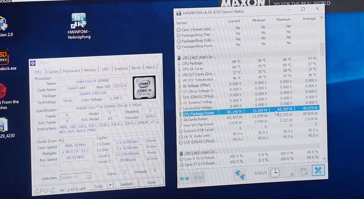 然后继续尝试,2核4线程的时候,温度降低到了70°C以内,功耗也低至65W了,但是频率依然停留在5.1GHz上。