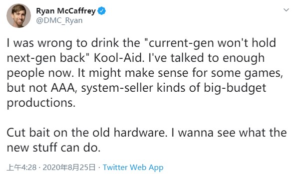 IGN编辑Ryan McCaffrey在推特上称,PS4和 Xbox One内部陈旧的硬件正在阻止开发者在Xbox Series X和PS5的次世代硬件上展示什么是真正的次世代游戏。