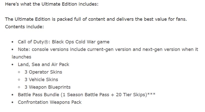 据泄露信息显示,《使命召唤:黑色行动冷战》的预购分为3个版本:标准版、跨世代版本、终极版。其中标准版游戏对应PS4/Xbox One/PC 平台,而夸世代版本则包含本世代主机版本和次世代主机版本,这也意味着动视将不会给玩家免费提供《使命召唤:黑色行动冷战》的次世代主机版本升级。