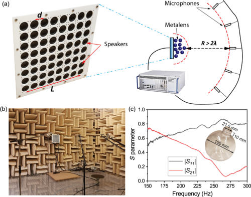 如 b 部分所示,随机插入了一簇亚波长亥姆霍兹谐振器之后,关于亚波长细节的信息辐射到了远场中。