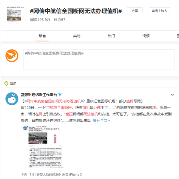今天坐飞机出行的网友遇到值机问题了吗?上午有爆料称由于中航信的系统出bug,导致全国机场的值机系统出问题,导致大量旅客行程受影响,现在中航信官方终于回应了。今晚中航信发布声明,针对全国机场断网问题做出了回应。