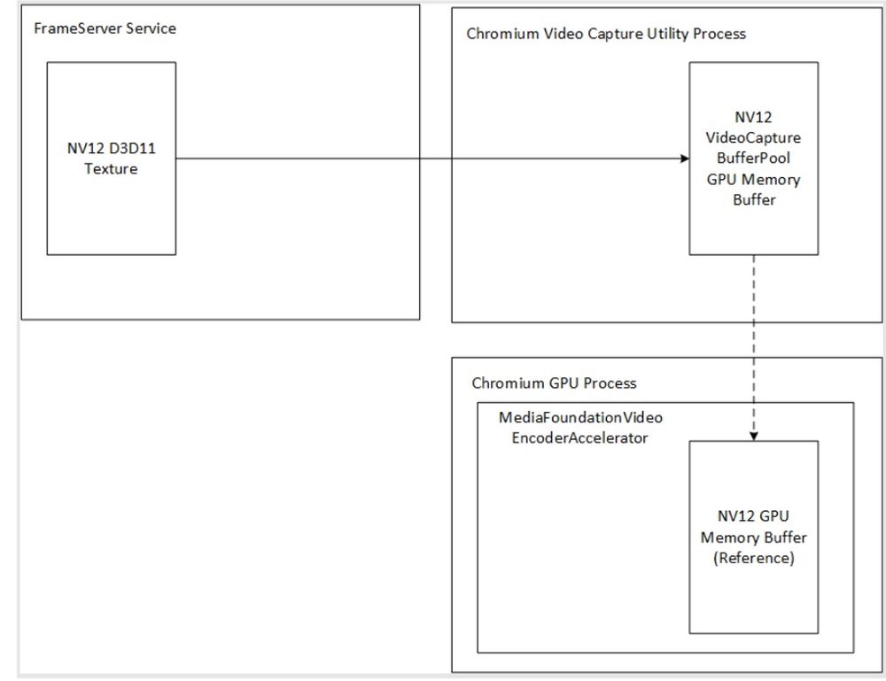 微软表示:“通过利用 Chromium 中现有的GPU内存缓冲基础设施,可以最大限度地减少副本数量”。通过这种方法,从NV12 D3D11纹理到VideoCaptureBufferPool NV12纹理只有一个拷贝,从而减少了过多的资源使用。