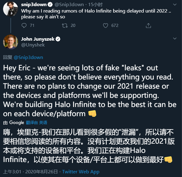 《光环:无限》开发商343 Industries旗下社区经理,John Junyszek通过推特回应了玩家关于游戏再次延期到2022年的传言。