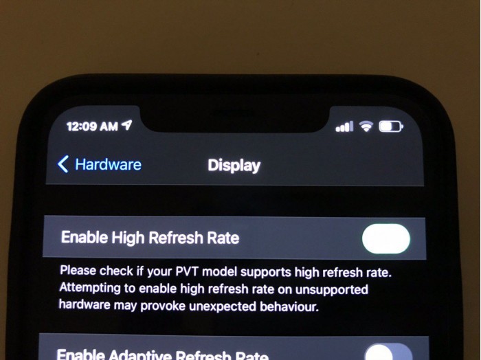 另外一张截图是显示设置,有全新的 Enable High Refrech Rate(开启高刷新率)以及 Enable Adaptive Refresh Rate(开启自适应刷新率),前者可以开启 iPhone 的高刷新率,后者可以根据显示内容在 120Hz 和 60Hz 刷新率间动态变换。