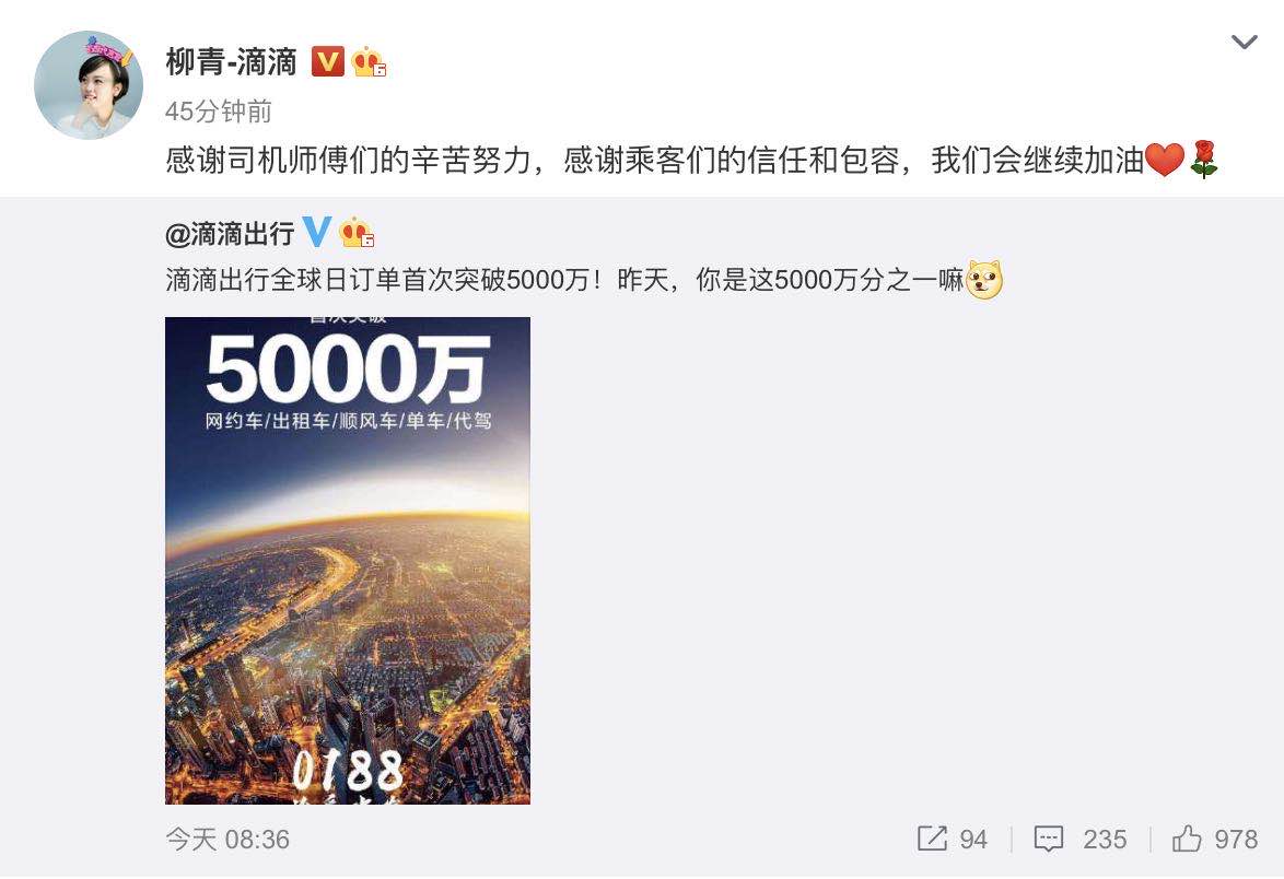 滴滴宣布日订单量突破5000万单 程维柳青致谢司机乘客