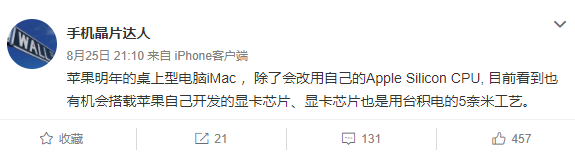 今年6月份的WWDC开发者大会上,苹果官方宣布,其Mac电脑将在未来两年左右的时间内,从Intel x86完全过渡到ARM自研芯片——Apple Silicon。据@手机晶片达人 最新爆料,苹果明年的桌面iMac,除了会改用自己的Apple Silicon CPU,还有机会搭载苹果自己开发的显卡芯片,二者均采用台积电5nm工艺打造。