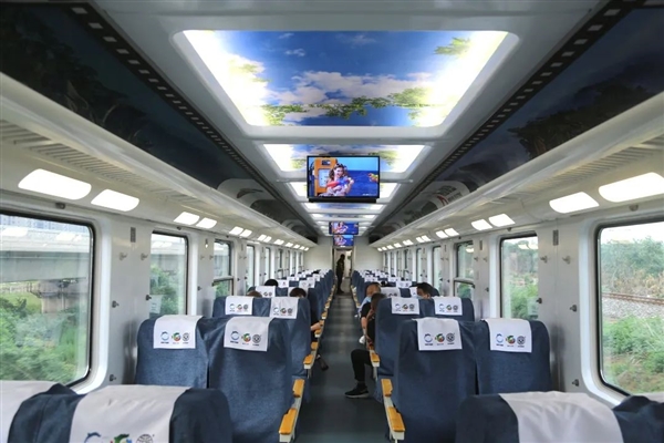 就连车厢内穹顶别出心裁,选择了代表生机的树枝绿叶和代表自由广阔的蓝天白云以及代表健康吉祥的红嘴蓝鹊,坐在车厢内令人心旷神怡。
