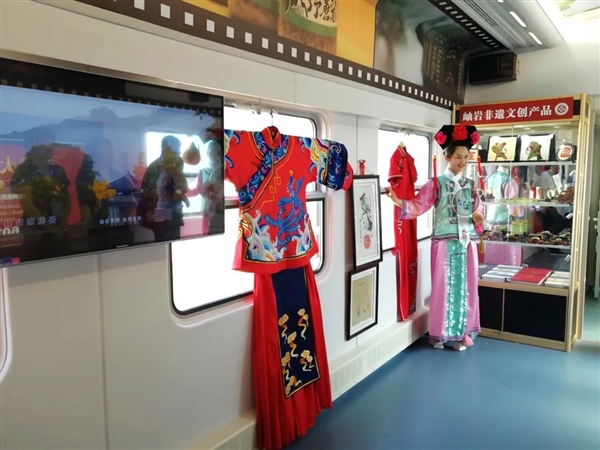 车厢内打造了四个大型背景板灯箱,配备液晶电视及展示柜。通过影音介绍、灯箱广告、实物呈现,全方位立体地展示地方特产及文化,使游客身临其境地感受到各地独特的魅力。