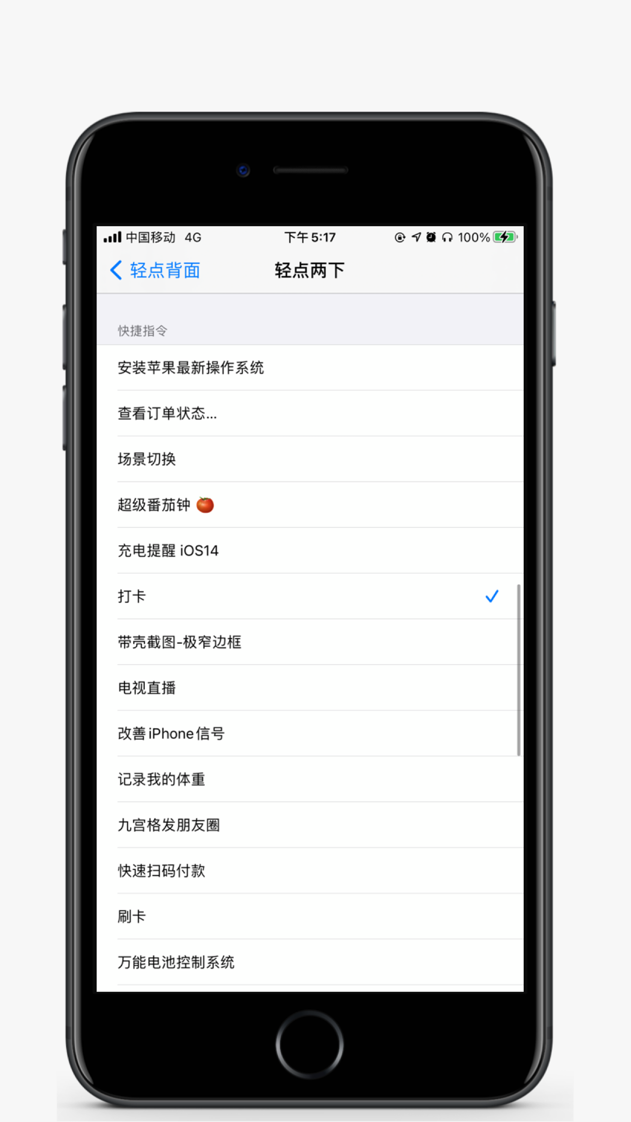 这个功能最大的亮点是,它可以和 iOS 系统的“快捷指令”App 协同使用,如果你经常使用“快捷指令”,你将会非常了解它的强大。你可以通过“轻点背面”激活日常使用的各类“快捷指令”而不需要打开“快捷指令”App 选择。