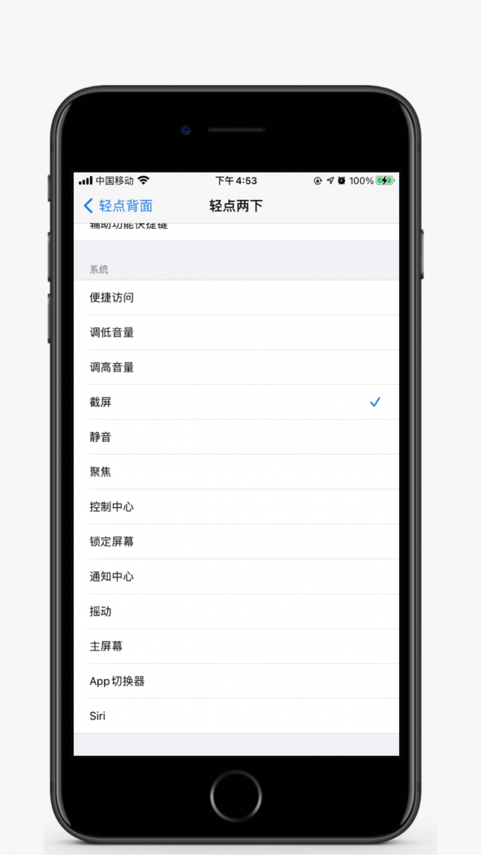如果你不使用“快捷指令”那也没有关系,你可以通过“轻点背面”完成简单的系统及辅助功能,例如“截屏”、“锁定屏幕”、“调整音量”和“控制中心”等常用的功能,同样非常实用。